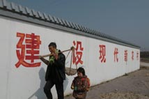 فلاح وحفيدته يمران أمام شعار "بناء الريف